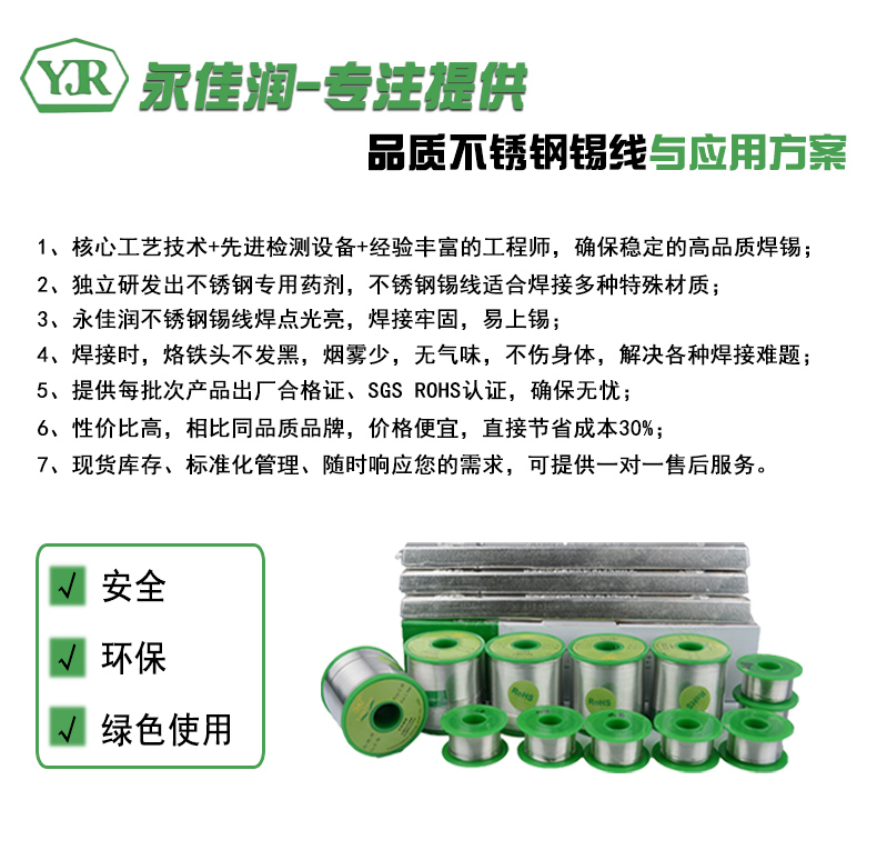 永佳潤(rùn)金屬生產(chǎn)的無(wú)鉛環(huán)保不銹鋼焊錫絲Sn99.3Cu0.7,采用云南錫礦高純度錫原料熔合電解銅,經(jīng)過(guò)特殊工藝精致而成;產(chǎn)品松香芯是采用自主研發(fā)的不銹鋼專用藥劑,其工藝特殊可靠,獨(dú)具業(yè)界領(lǐng)先水平;廣泛適用于家用電器、汽車(chē)電子、精密醫(yī)療器械等不銹鋼材質(zhì)產(chǎn)品的軟釬焊錫。